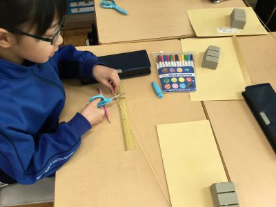 竹ひごを9cm・6cm・4cmに切り分けます。カラーペンで色分けをして、組み立ての準備です。