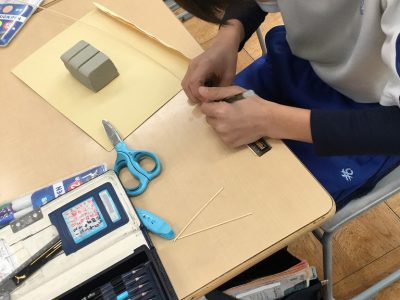さあ、今日の算数は、ねん土玉と竹ひごを使って、はこの形を作る時間です。