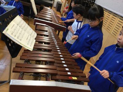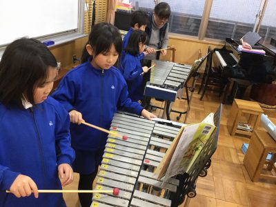 こちらは、音楽の時間。♪アンダルコの歌を、鍵盤ハーモニカのメロディーに合わせて、木琴や鉄琴の副旋律を重ねようと、練習中です。