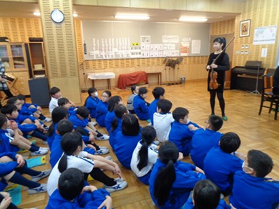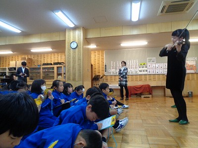 4時間目の音楽の時間は、ヴァイオリン・ピアノの演奏&お話を聞く「アウトリーチ」の時間でした。昨年末の前回に続いて2回目です。