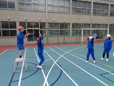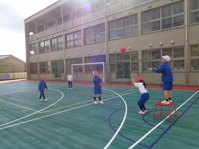 体育では、7周走をした後、ポートボールの練習を始めました。
