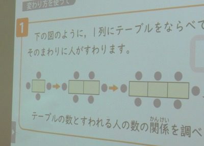 次は、この関係を式に表します。前回の学習では、テーブルの数を○、座れる人数の数を△と記号に置きかえて、式に表すことも学習しました。いろいろな式を立てて発表し合います。