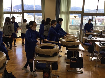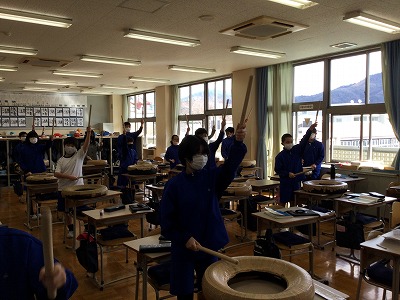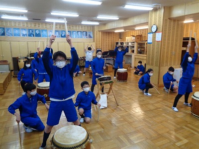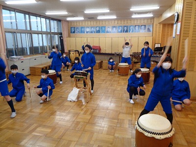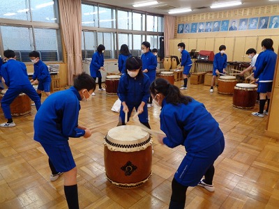 教室で練習している「嵐山太鼓」組です。