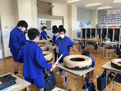 タイヤを使って、昨日までの打ち方やリズムのおさらいをしました。