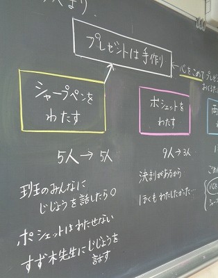 ここからは6年生の様子を思い出しながら、喜んでもらえそうな飾りをつけたり、ペンで描き込んだりしていきます。