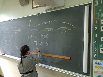 問題文の中で、どの数量を□とするのか、そして、式は足し算なのか引き算なのか、じっくり考えて取り組みました。