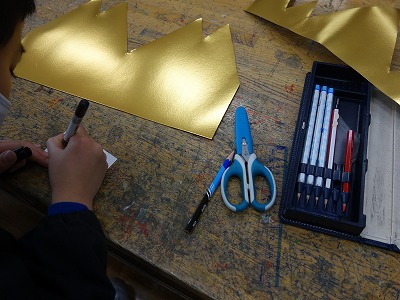 ぴかぴかの冠ができあがりました。後片付けなども含めて、協力し合いながら必要な数をつくることができました。