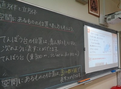 5時間目の算数は、直方体と立方体の単元を取り組んでいます。はじめに、垂直・平行の辺や面について復習しました。その後は、2クラスに分かれて、平面や空間の場所の表し方について学習しました。