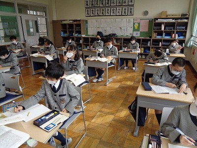 水曜日の朝は、制服での放送礼拝です。静かに心を落ち着けて、仏様に向き合いました。今日は、校長先生のお話に、合掌の姿勢についてのお話がありました。背筋を伸ばして、美しい姿を作ります。4年生としての学校生活も、残り24日となりました。どのような姿勢で過ごすべきか、心の中でしっかり考えます。