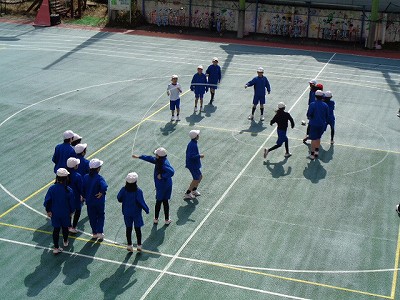 グランドから教室にまで「せーの!」「1、2、3…」、ひっかかってしまって「ごめん!」「いいよ、次、すぐすぐ!」などのかけ声が聞こえてきます。