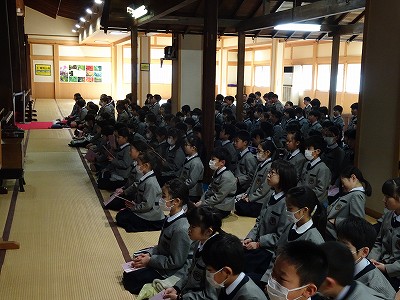 去年の春・・・「入学・進級参拝」のために、知恩院へお参りしました。その時、「これから一年間、努力していく目標」を、仏さまや法然さまにお誓いしました。 知恩院のお導師様より「みんな、毎日毎日おつとめをしましたね。仏さまや法然さまをはじめ、亡くなられたご先祖さまも、みんなの一日一日の努力を見守って下さっていたのですよ。」と、温かく言葉をかけて頂きました。