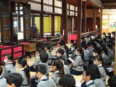 学校の礼拝で取り組んでいるように、知恩院でも、音楽と皆の声を通してお勤めする「音楽法要」に臨みました。係の児童が「明かり、お香、お花」を捧げます。仏教聖歌を8曲歌い「四誓偈」を読みました。