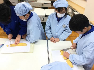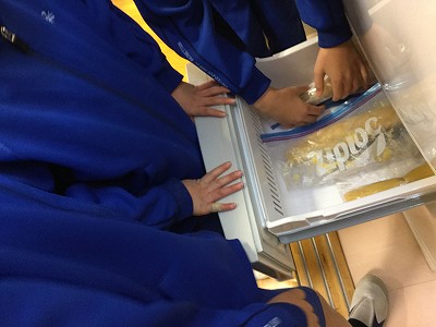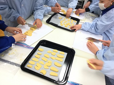 チャイムが鳴るまでに下準備が完了しました。棒状に整った生地は、6校時のクラブまで、冷凍室でひと休みさせます。