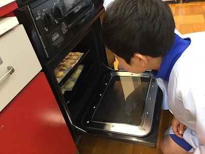 温めておいたオーブンにいざ投入。焦げ目が気になる4年生男子陣…