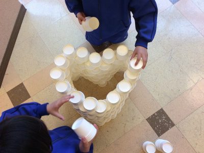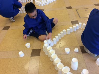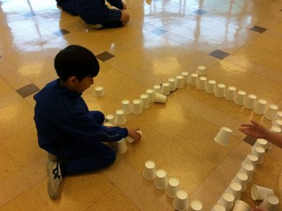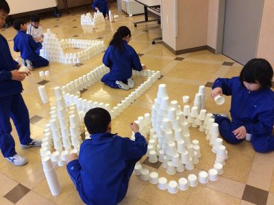 たくさんの紙コップを<ならべる><つむ>だけで何を作られるか、みんなの遊び心の見せ所です。