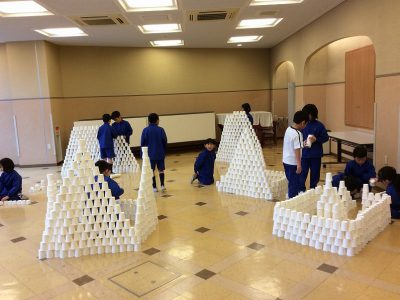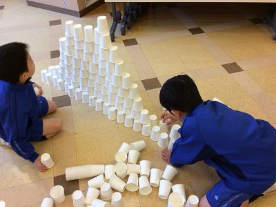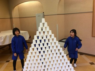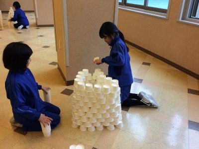 2/19火【English + 図工『つんで、ならべて、カップタワー』]