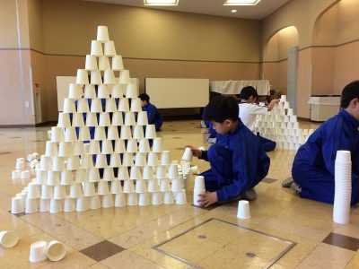 それぞれ作戦を練りながら、紙コップを重ねていきます。