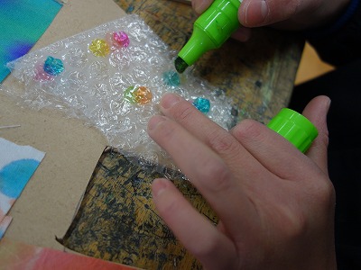 また、緩衝材(プチプチ)も丸い形に着目し、周りの材料よりも目立つ色に着色している児童もいました。