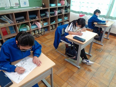 今週の最後、6時間目は社会です。昨日から「都道府県カルタ」の作成をスタートしました。6つのチームに分かれ、47都道府県の読み札を、それぞれの県の物産や特徴などを交えながら「5・7・5」で作成しています。