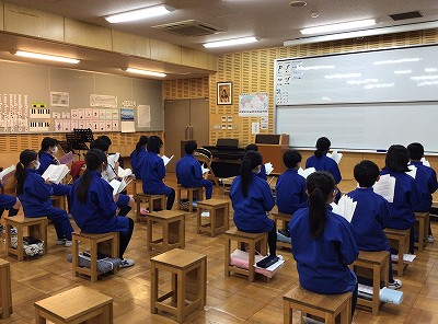 聖歌の練習をしています。秋から仲間入りをしてくれた友達のお手本になるような歌唱を広げています。
