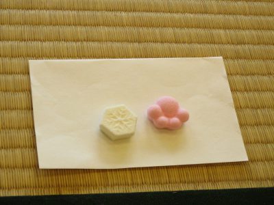 雪の結晶と梅の花のお菓子です。