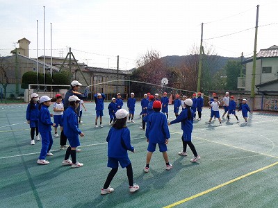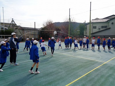 体育授業では、今日も大縄とびからスタートです。前回にも増して、大きなかけ声がグランドに響きます。