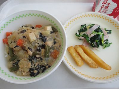今日の献立は「野菜のあんかけ丼、さつまいもの素揚げ、ほうれん草のサラダ」でした。