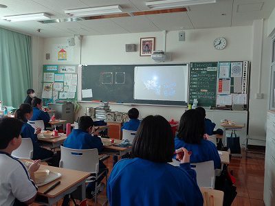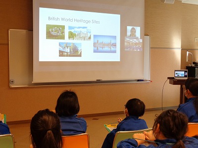 日本とイギリスを比較しながら、イギリスの国土・人口・高い山などの概要を知り、自分の想像との違いに、みんなで「え~」と驚いていました。