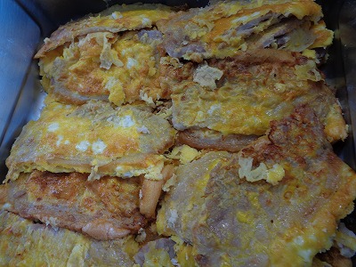 ☆ ポークピカタは、豚肉に塩こしょうで味つけした後、卵をからませて焼いています。