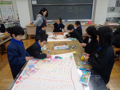 チーム毎に、「どんな木にするのか」「何を描くのか」「切り紙をどこに貼るのか」を相談して、楽しい作品に仕上げていました。