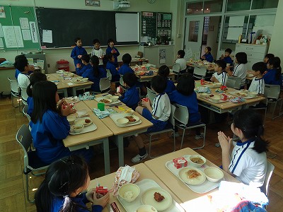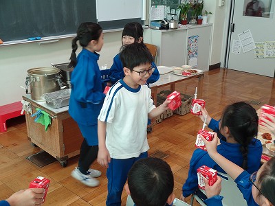前に出てきてもらい、みんなで牛乳乾杯です。
