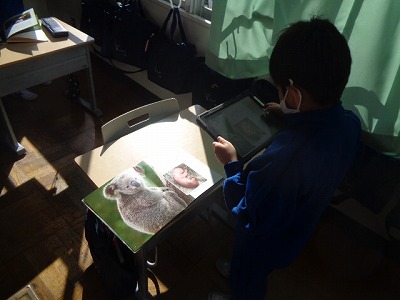 『どうぶつの赤ちゃん』の学習です。自分で調べたい動物を一つ選び、調べたい情報を探し、タブレットに記録しました。