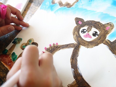 土で描いた絵がすっかり乾いている様子を見ると、絵の具やカラーペンを併せて使いたいという児童の要望が多くありました。そこで、今日は土の色を生かすことをめあてにして、他の材料で描き足していく時間となりました。