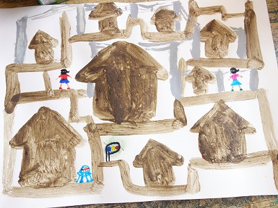 土の絵の具の色が映える色を考えて、使いすぎないように絵の具を使ったり...
