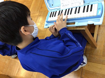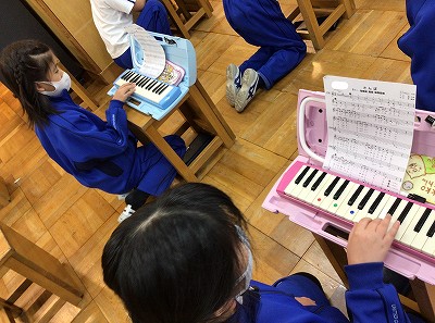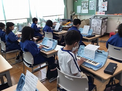 教師が弾くメロディとは、全く違う旋律を奏でるみんなの演奏です。その“オブリガード”が、ばっちりとコラボして、教室に「新しい♪さんぽ」の音楽が響きました。