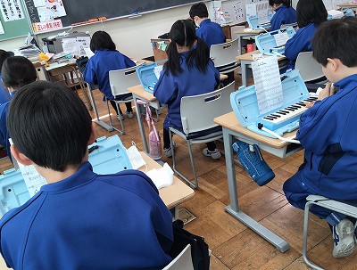 教室での、音出し練習です。マスクを外す時間は短いので、音楽室での“エア練習”が効果的に働いています。