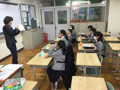 母音に注意しながら、単語カードを読んでいます。ピアノや鳥、ラジオなど身の回りの物の名前をインプットしています。自信がない名前も、先生と言い直し、はっきりと発声しています。