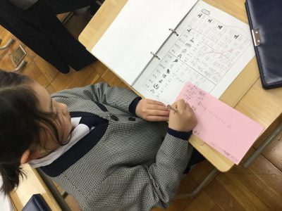 発声の後は、書く活動です。軸となる文字が組み合わさって一つの音になることを理解し、発声とともに書く学習にも力が入ります。
