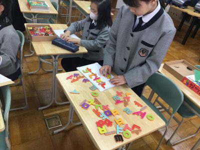 最後は、カラフルな文字ブロックを使った「言葉作り」を行っています。自分の名前→近くの人の名前と、ブロックで組み合わせた後は、先生が提示された単語を素早く作る活動へと進みました。ソフトな手触りのブロック。しかも、ポップな色合いに、言葉作りが盛り上がります。
