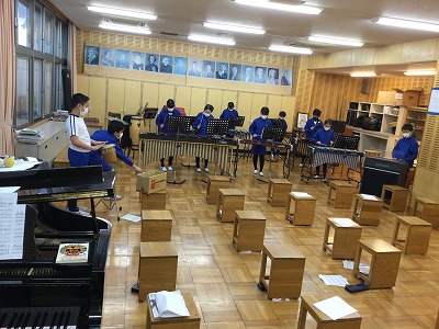 オルガンの響きで、中盤のメロデイがはっきりと表現されてきました。低音楽器のボリューム調整を行い、鉄琴の高い音が響きます。合奏の仕上がりも上々です!
