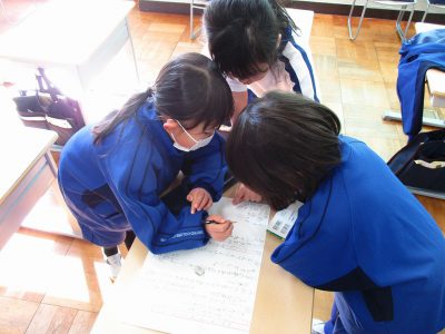 教室では、飾り・新聞係のメンバーが「なぞなぞ新聞」を作っていました。