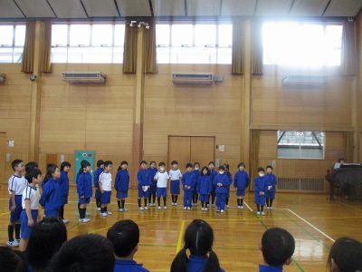 「6年生ありがとうの会」に向けて、2年生と一緒に体育館で練習しました。