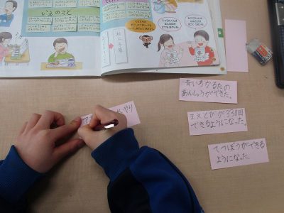 今日は「学校でできるようになったこと」を振り返り、小さなカードに書きました。