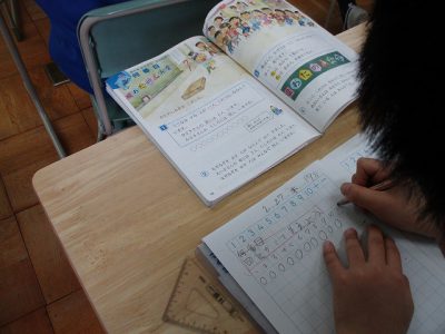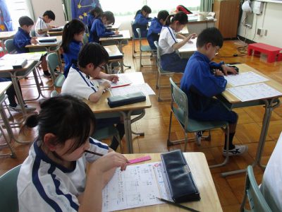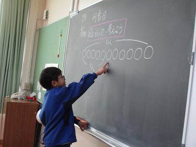 子ども達は、11人が一列に並んでいる図を描けばよいことに気づき、ノートに図を描いて問題を解いていきました。