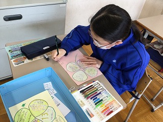 下学年から届いた“クローバーの葉”を集め、班毎に貼り付けて“ブックカバー”の仕上げに取り掛かっています。