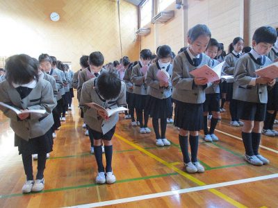 礼拝後、1~5年生は3月8日(木)の「ありがとうの会」で歌う合唱曲「この星に生まれて」を練習しました。