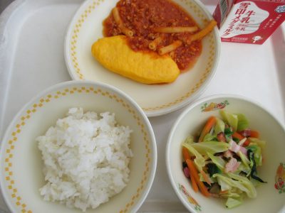 今日の献立は「オムレツ、ミートソース、キャベツのサラダ」でした。