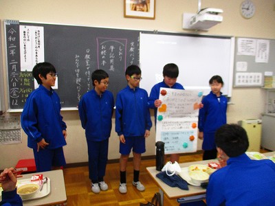 「ありがとうの会」を午後に実施することになり、イベント委員の児童が、6年生の給食中に招待状を持っていきました。6年生みんなの前で、その内容を読んでいるところです。
