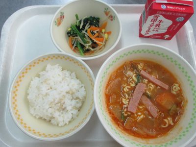 1日目は「韓国」です。煮干しと昆布で出汁をとり、コチュジャンで少し辛みの効いたチゲと、豆もやしのナムルでした。チゲには韓国ラーメンを入れました。麺の成分には小麦のほか、ジャガイモが入っています。