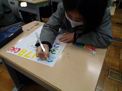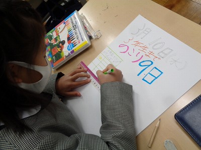 今日は、日めくりカレンダー作りです。3年生までに頑張りたいことや来年度への目標、挑戦したいこと、好きな○○などを一枚の画用紙に書き表す活動です。